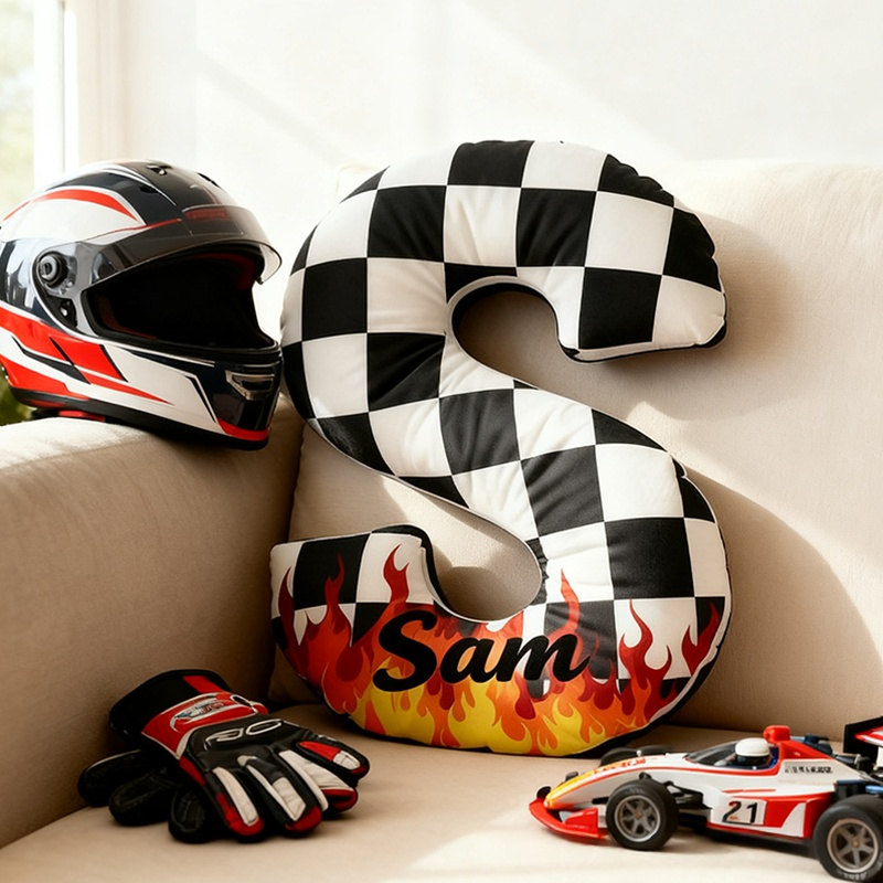 Add speed and style to your home with this Personalized Racing Letter Throw Pillow. Designed with a bold checkered pattern and fiery flame detail, this pillow can be customized with your name and letter shape, making it a unique accent for any racing fan. Made from soft, high‑quality fabric with vivid printing, it’s perfect for decorating living rooms, bedrooms, or game rooms, and makes a great gift for car lovers and racers.
